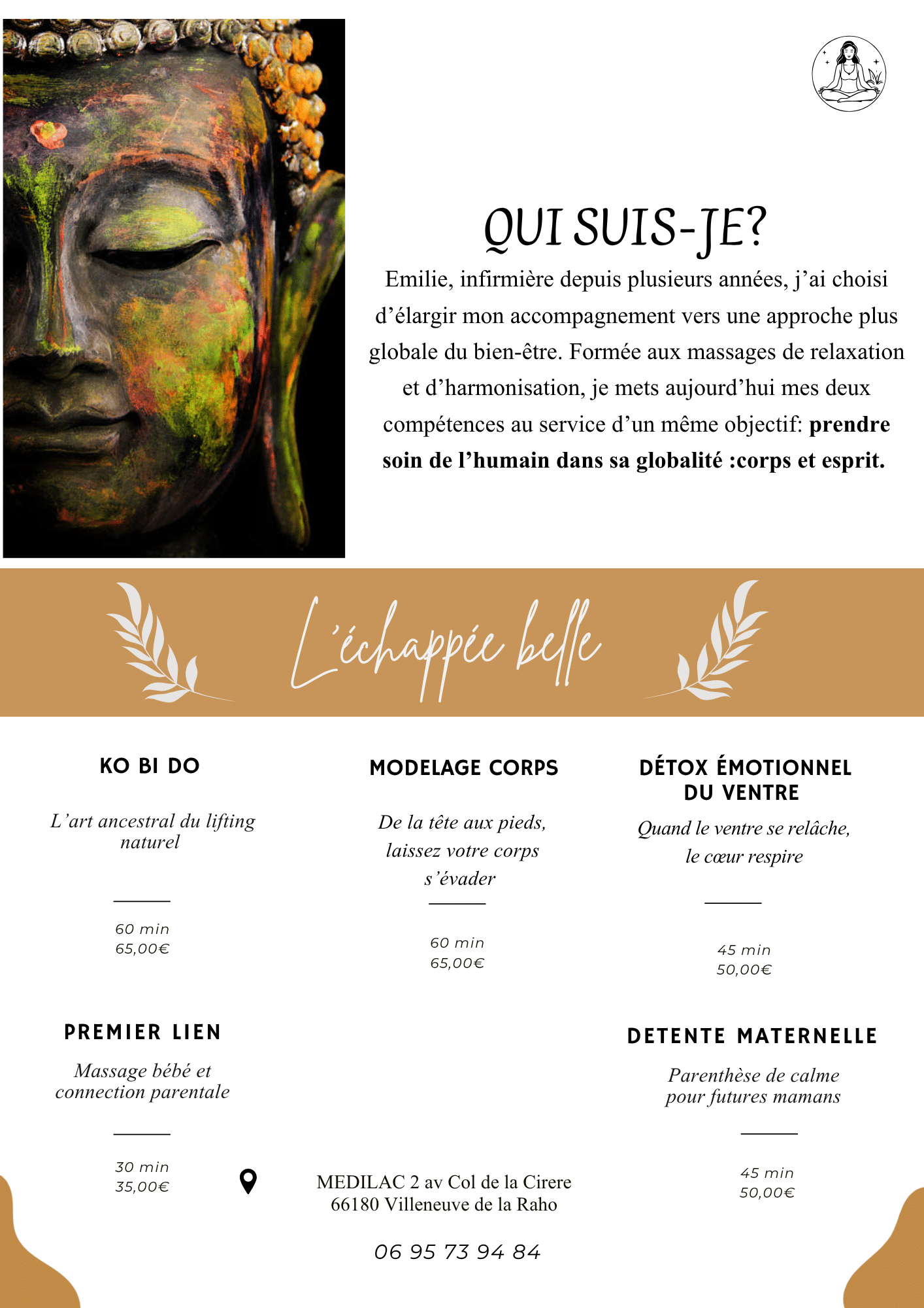 Emilie, infirmière depuis plusieurs années, j’ai choisi d’élargir mon accompagnement vers une approche plus globale du bien-être. Formée aux massages de relaxation et d’harmonisation, je mets aujourd’hui mes deux compétences au service d’un même objectif: prendre soin de l’humain dans sa globalité :corps et esprit.